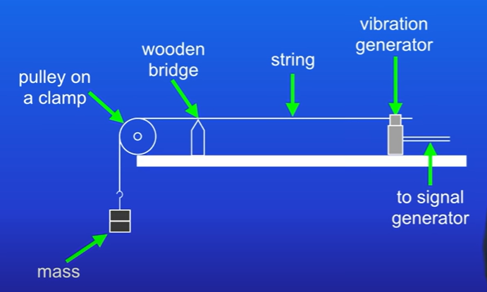 Using the metre rule, measure the distance from the wooden bridge to the vibration generator. This is the wavelength of the wave