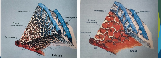 As sinusoidal muscle tone decreases and sinusoids distend with blood, the small emissary veins are compressed between sinusoids and the peripheral tunica albuginea.