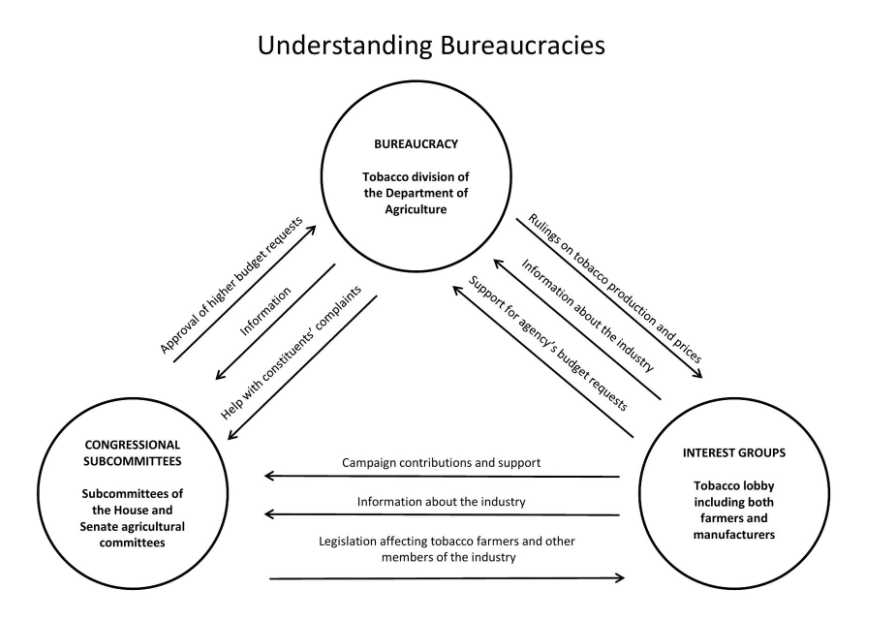 3 parts - interest groups, bureaucracy, congress subcommittees