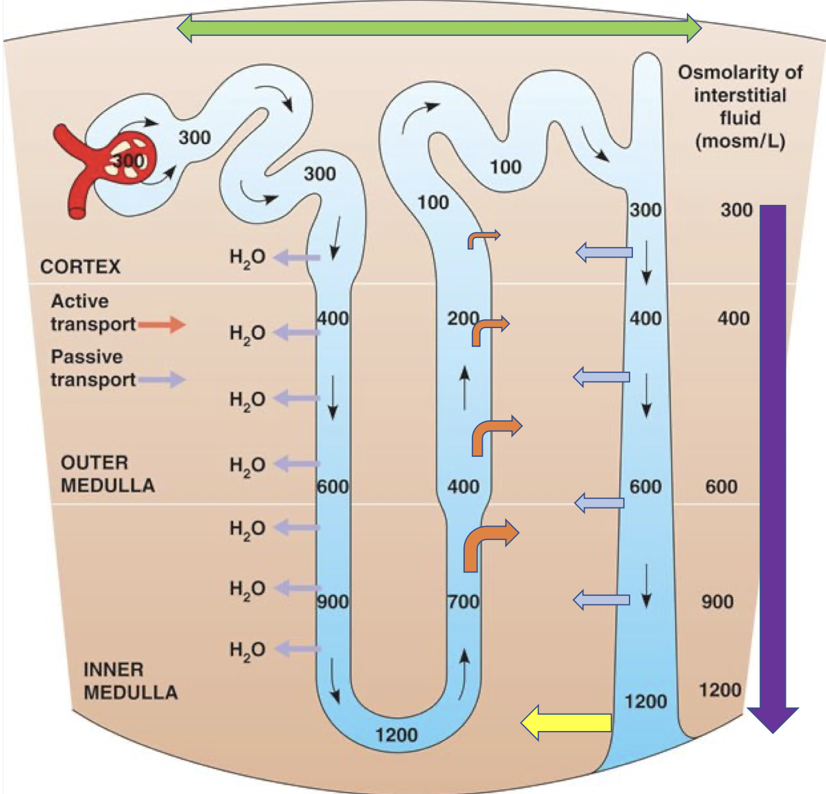 the establishment of this osmotic gradient ensures that water continues to move out of the entire length of both the descending loop of henle and the collecting duct