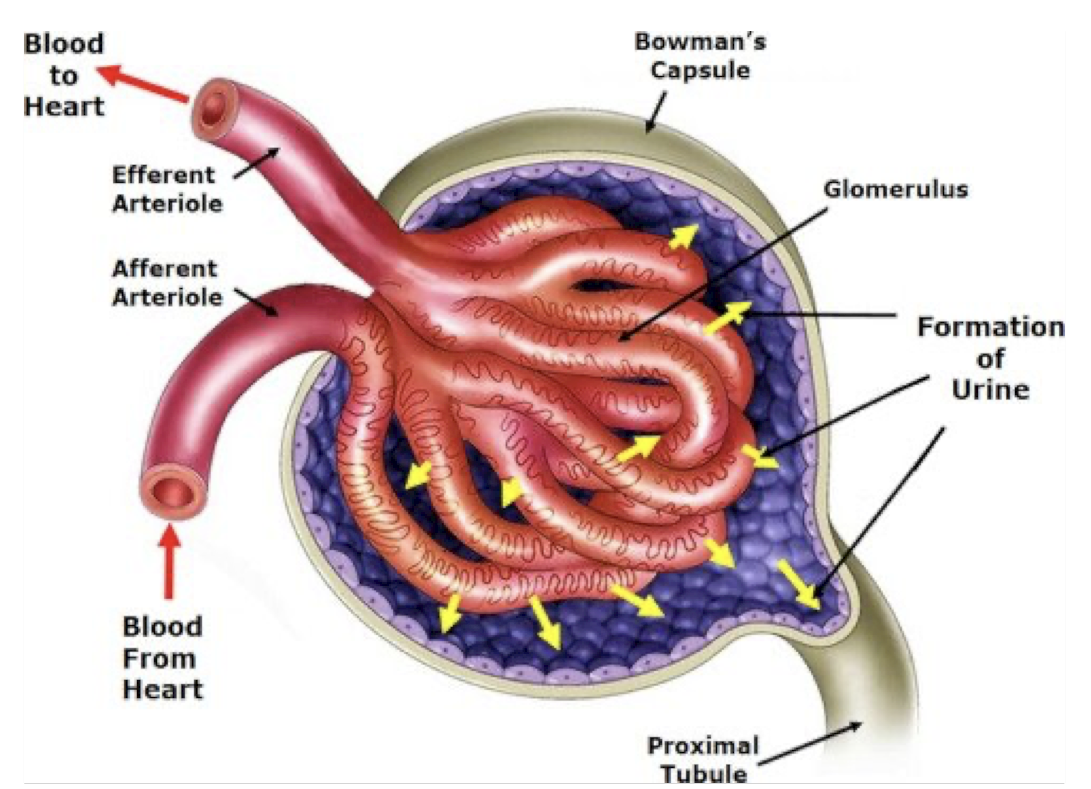 afferent (incoming) arteriole goes into the bowman’s capsule and branches into the glomerulus