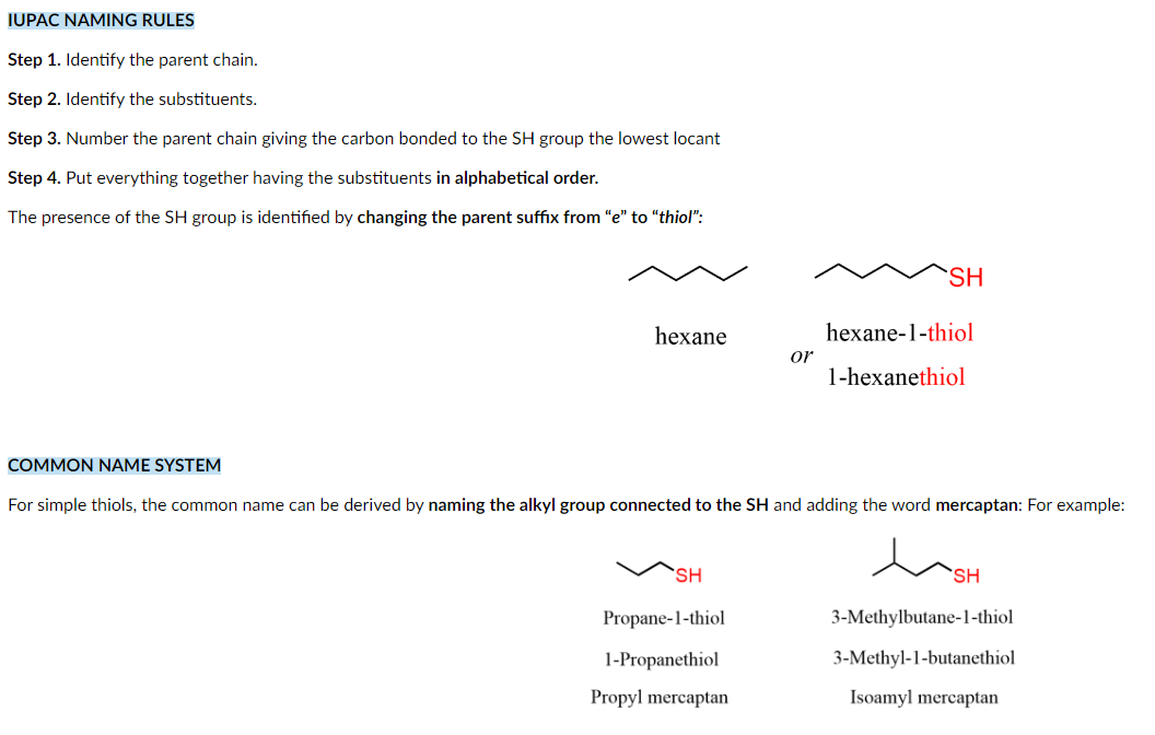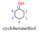 When naming a cyclic thiol, start numbering the ring beginning with the carbon connected to the SH group. This rule always puts the SH group at C1, therefore, the “1” is usually omitted from the name