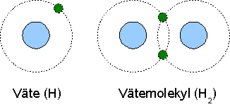 En valenselektron från varje atom “delar” på elektronerna vilket kopplar ihop atomerna. Eftersom icke-metallerna vill ta upp elektronerna kan ämnena inte binda med jon- eller metallbindning. De får alltså samsas om elektroner vilket bildar en molekylbindning. Två elektroner, en från varje atom skapar ett elektronpar som blir gemensamt för atomerna, de båda räknar det som sina egna.
