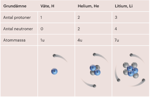 Det är antalet protoner i atomen som bestämmer vilket grundämnet är. I ett grundämne har alla atomer samma antal protoner, fast antalet neutroner kan variera. Dessa är alltså olika varianter av samma grundämne och kallas för isotoper, de är samma grundämne fast de har olika atommassa.