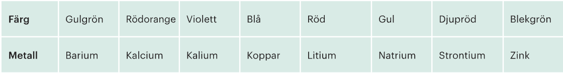 I fyrverkerier finns metallsalter, det är bl.a metalljonerna i saltet som skapar färgerna i fyrverkerierna. Färgen påverkas av många faktorer, men om man värmer metallsalter i en låga kan det skapas olika färger.