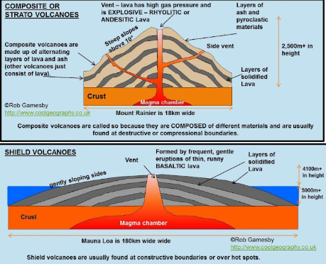 Refer to the image below for a visual comparison of the differences between a composite or shield volcano. The shield volcano diagram should also be added to your notes.