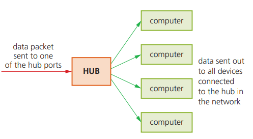 A hub will take a data packet received at one of its ports and broadcast it to every device connected to it, because the data packets are delivered to every device connected - 1) hubs are not very secure as all the devices connected will receive each data packet. 2) There will be unnecessary traffic, which results in reduced bandwidth