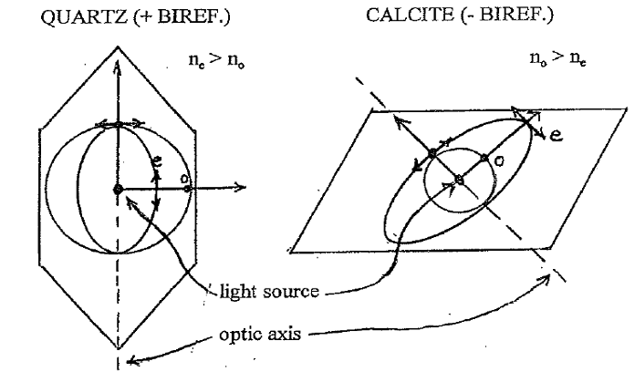•The two e- and o-rays will be acted upon by different n's and will be refracted at different angles.