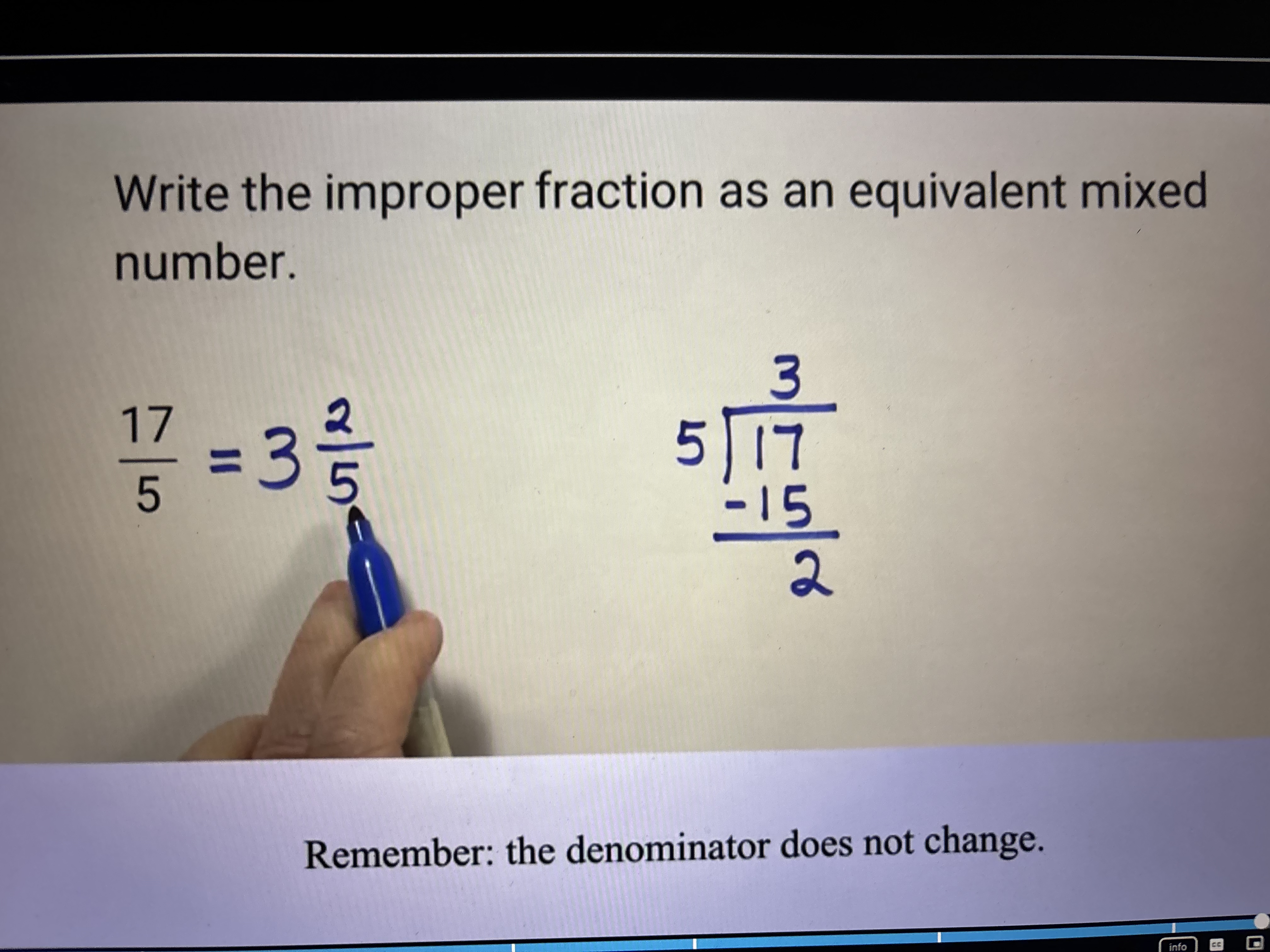 step 2: the whole part of the mixed number is the quotient. the fraction part of the mixed number is the remainder of the original denominator.