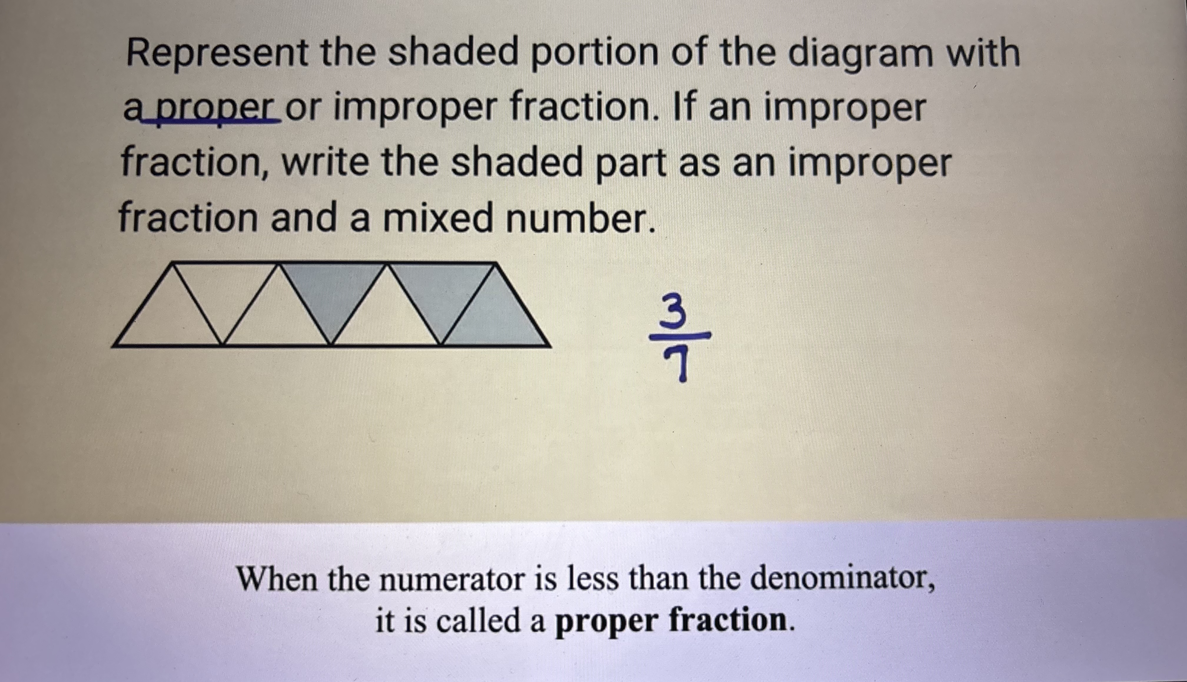 Ex: ½ is a proper fraction. 10/3 is a improper fraction