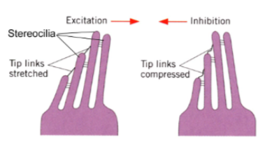 When sound causes the oval window to vibrate, a pressure wave moves along the cochlea and causes the basilar membrane to vibrate up and down. The basilar membrane and the tectorial membrane will move very slightly relative to each other, causing deflection of the stereocilia. The tip links will stetch and open membrane channels, and then subsequently relax and close membrane channels. This generates an electrical signal in the hair cells.