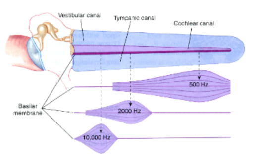 Low sound frequencies cause higher amplitudes of vibration at the apex end