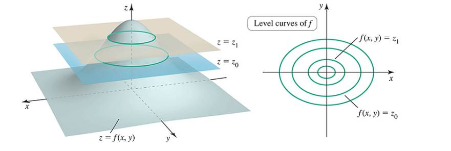 Levels curves are essentially when you take a function in , and slice it with planes that intersect the axis.