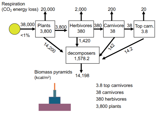 Energy flow between trophic levels → assimilation efficiency is higher for animal food than plant food (indigestible cellulose and lignin)