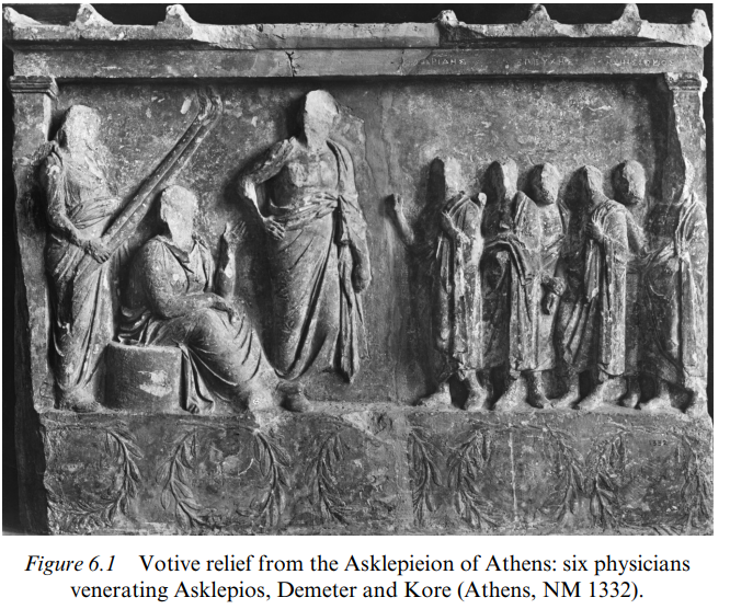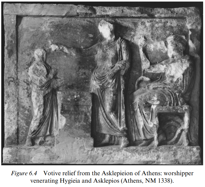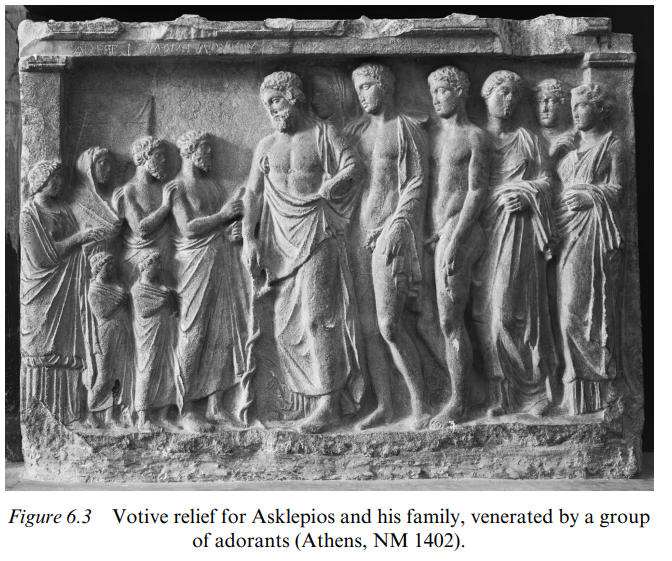 “But this remarkable trend towards rendering Asklepios as similar to an Attic citizen goes even further. In a relief from the Athenian Asklepieion the god is not sitting upright, as usual (Fig. 6.4).”