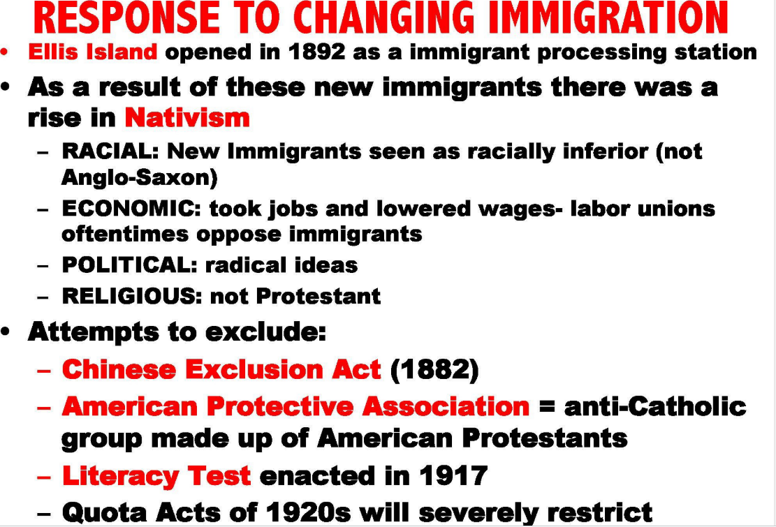 Anti-Immigration Legislation: Restrict criminals, the insane, the infectious, alcoholics, and illiterates. Along with this, they passed the Chinese Exclusion Act and started the American Protective Association.