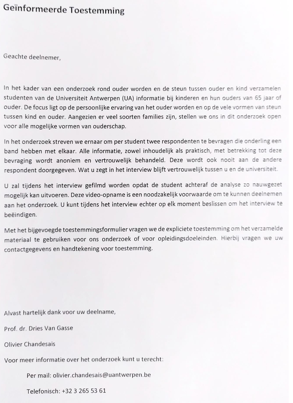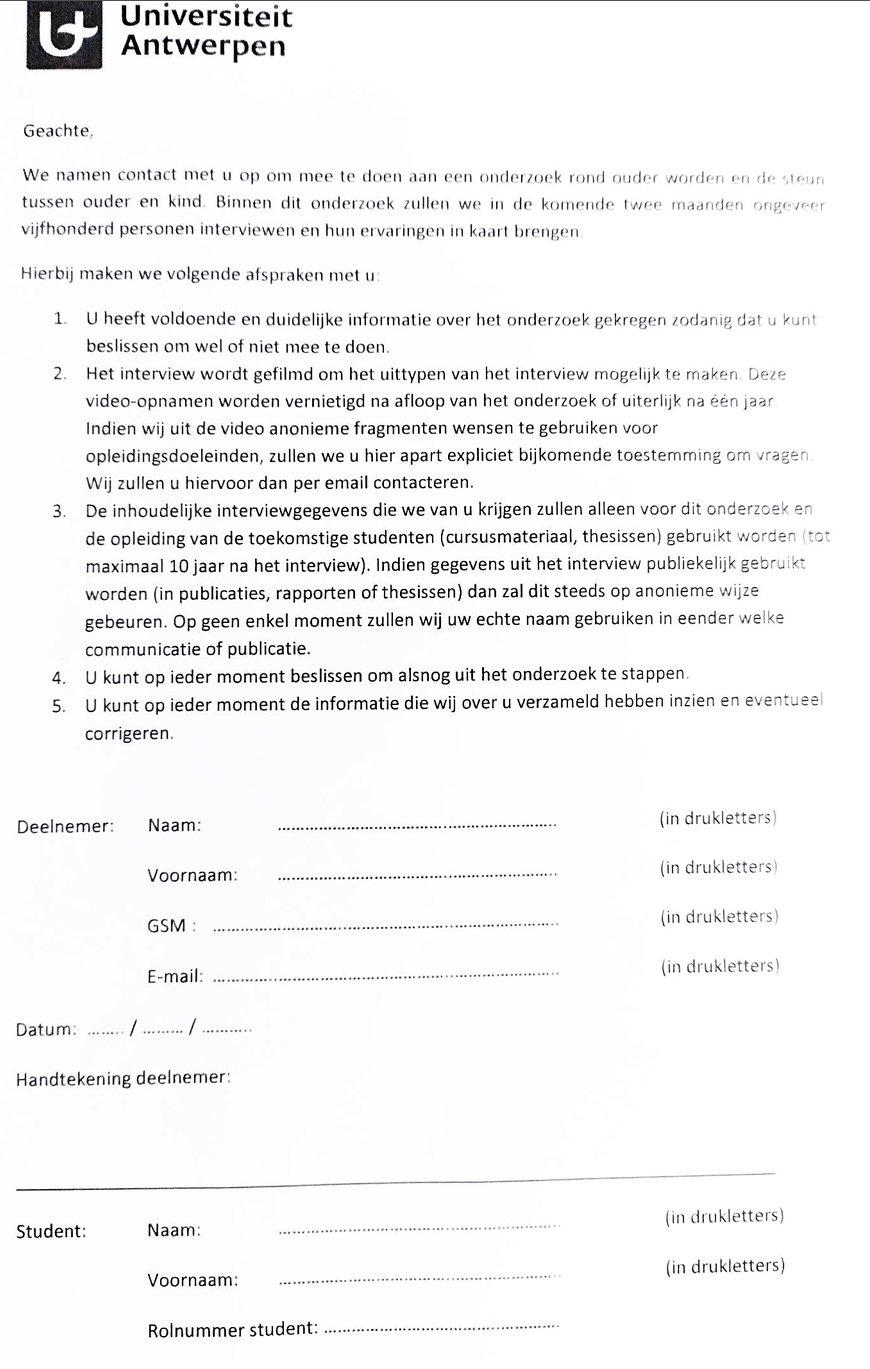 Toestemmingsformulier: van het Ethics Committee for the Social Sciences and Humanities (EA SHW) van UAntwerpen. Het formulier dat nodig is om toestemming te geven. Wordt ingevuld door participanten.